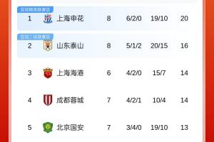 體育資訊04月19日訊 中超第8輪,申花2-0三鎮(zhèn),國安6-1泰山,目前中超積分榜上,申花4分領(lǐng)跑,下輪將與泰山直接交手。