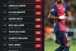 體育資訊4月26日訊 數(shù)據(jù)機(jī)構(gòu)Squawka統(tǒng)計(jì)了西甲本賽季至今完成過人次數(shù)的排行榜,亞馬爾131次完成過人斷層領(lǐng)跑西甲!
