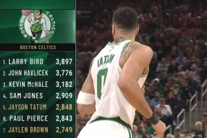 目前,塔圖姆已經(jīng)得到13分,他在凱爾特人的季后賽總得分來到2848分(賽前為2836分),超越保羅-皮爾斯,上升至凱爾特人隊(duì)史第五位,前一位是薩姆-瓊斯。