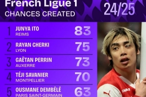 其中效力于蘭斯的日本快馬伊東純也以83次位居榜首,切爾基和蓋坦-佩蘭分別以75次和73次位列二三位,登貝萊63次排在第5,李剛仁57次排第6。