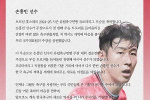 “繼英超金靴等眾多記錄之后,孫興慜再次樹(shù)立新的里程碑,向世界展示了韓國(guó)足球的潛力。感謝你一如既往為熱愛(ài)足球的韓國(guó)人民帶來(lái)巨大的喜悅和勇氣,謹(jǐn)致以最誠(chéng)摯的祝賀。希望你今后繼續(xù)書(shū)寫(xiě)韓國(guó)足球的新歷史?!?/p>