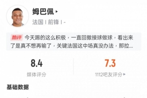 體育資訊6月6日訊 歐國聯(lián)半決賽,法國4-5西班牙,無緣決賽。姆巴佩首發(fā)出戰(zhàn),傳射建功,另外他還有3次過人成功,2次關(guān)鍵傳球,評分8.4。