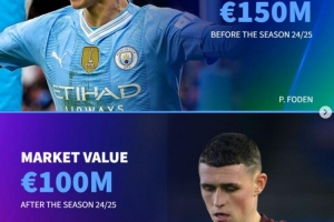 福登(曼城),現(xiàn)身價(jià)1億歐,賽季前1.5億歐,-5000萬歐
