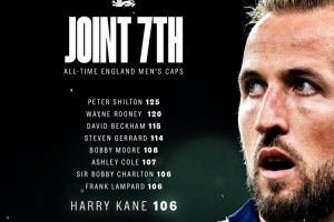 賽后,英格蘭國(guó)家隊(duì)在社交媒體曬出凱恩海報(bào),祝賀他的出場(chǎng)紀(jì)錄已經(jīng)并列英格蘭隊(duì)史第七。