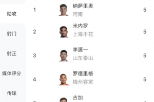 體育資訊6月15日訊 今日,中超聯賽官方更新了聯賽截至昨晚22時的助攻榜,其中河南外援納薩里奧、申花外援米內羅、李源一以及梅州外援羅德里格均貢獻5次助攻,并列排在聯賽助攻榜首位。