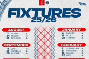 體育資訊6月28日訊 巴黎25-26賽季法甲賽程公布,首輪8月17日客戰(zhàn)南特,末輪明年5月16日客戰(zhàn)巴黎FC。