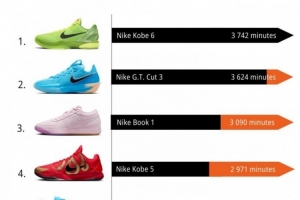 值得一提的是,在相關(guān)NBA的統(tǒng)計(jì)中,科比球鞋同樣是占據(jù)前列。