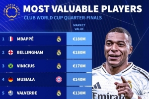 世俱杯八強(qiáng)身價(jià)榜:前五皇馬4將+穆西亞拉,帕爾默、登貝萊在列