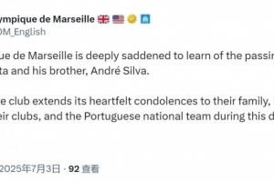 馬賽社媒寫(xiě)道:“馬賽俱樂(lè)部對(duì)若塔和他的兄弟安德烈-席爾瓦的去世深感悲痛。在這個(gè)艱難時(shí)刻,馬賽全體成員向他們的家人、親友、俱樂(lè)部和葡萄牙國(guó)家隊(duì)致以最誠(chéng)摯的慰問(wèn)。”