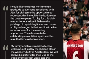 體育資訊7月10日訊 亨德森與阿賈克斯就終止合同達成一致,自由身離隊,阿賈克斯官方更新社媒動態(tài),曬出亨德森的告別信。