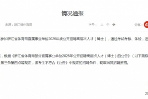 經(jīng)考察核實(shí),根據(jù)《浙江省體育局部分直屬事業(yè)單位2025年公開招聘高層次人才(博士)的公告》(以下簡(jiǎn)稱《公告》)第二條第二點(diǎn)、第三條第四點(diǎn)等規(guī)定,該考生不符合《公告》中規(guī)定的招聘條件,現(xiàn)取消其招聘資格。