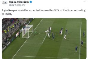 數(shù)據(jù)機(jī)構(gòu)The xG Philosophy賽后發(fā)布統(tǒng)計(jì)數(shù)據(jù)指出,曼聯(lián)這次丟球中,根據(jù)的對(duì)手的射門(mén)質(zhì)量,守門(mén)員應(yīng)有94%的概率將這球救下。然而奧納納致命脫手最終導(dǎo)致丟球。