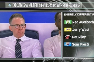 比賽期間,電視轉(zhuǎn)播商曬出了一項(xiàng)數(shù)據(jù),雷霆總經(jīng)理普雷斯蒂執(zhí)掌兩套完全不同的陣容都打出60+勝場賽季,他是歷史上第4個能做到這一點(diǎn)的GM,之前三人是奧爾巴赫、杰里-韋斯特和帕特-萊利。