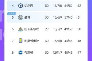 英超爭(zhēng)五:第4切爾西52分、第5曼城51分、第6紐卡少賽一輪50分、第7阿斯頓維拉48分、第8布萊頓47分……