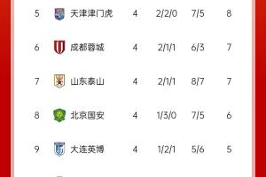 其他比賽天津津門虎2-2北京國安、山東泰山0-3成都蓉城、青島海牛1-1大連英博、上海申花3-1云南玉昆、長(zhǎng)春亞泰1-1武漢三鎮(zhèn)。最新積分榜如圖。