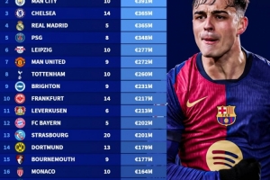 體育資訊4月5日訊 德轉(zhuǎn)盤點(diǎn)了五大聯(lián)賽球隊(duì)中,所有U23球員身價最貴榜單,其中巴薩12位U23球員身價之和達(dá)到6.15億歐高居榜首,具體榜單如下(隊(duì)內(nèi)U23球員人數(shù)+身價之和):