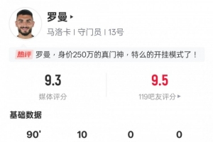 體育資訊5月15日訊 西甲第36輪,馬洛卡1-2不敵皇馬。馬洛卡門將羅曼本場(chǎng)比賽首發(fā)出戰(zhàn),10次撲救全場(chǎng)最多,評(píng)分9.3全場(chǎng)最高。