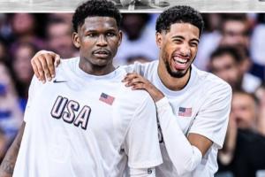 去年巴黎奧運會美國男籃12人名單:詹姆斯、庫里、杜蘭特、濃眉、恩比德、塔圖姆、布克、朱-霍勒迪、安東尼-愛德華茲、哈利伯頓、阿德巴約、德里克-懷特;
