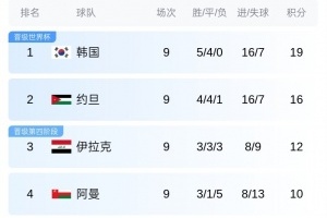 積分榜方面,韓國19分領(lǐng)跑,約旦16分第二,兩隊(duì)攜手晉級(jí)世界杯;伊拉克12分第三,阿曼10分第四,巴勒斯坦9分第五,科威特5分墊底。