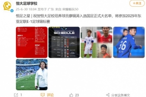 廖錦濤出自恒大足校,恒大足校也對廖錦濤的入選表示了祝賀,恒大足校寫道: 祝賀恒大足校培養(yǎng)球員廖錦濤入選國足正式大名單,將參加2025年東亞足聯(lián)E-1足球錦標(biāo)賽。
