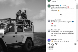 在社交媒體上,特爾施特根曬出了兩人坐在一輛越野車頂的甜蜜照,并寫道:親愛的,生日快樂!讓我們一起經歷更多的冒險!愛你呦!