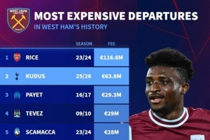 西漢姆出售球員轉(zhuǎn)會(huì)費(fèi)排名: