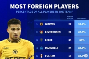 體育資訊7月13日訊 《轉(zhuǎn)會(huì)市場(chǎng)》統(tǒng)計(jì)了當(dāng)前五大聯(lián)賽一線隊(duì)外援占比情況,狼隊(duì)是唯一超過(guò)9成的球隊(duì)。